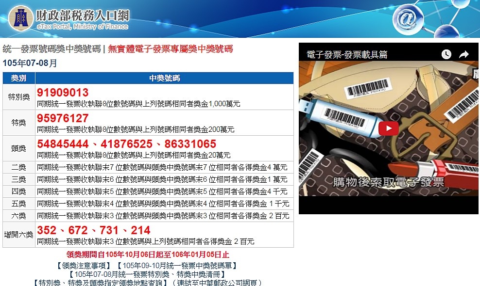 1 2 3 4 5 6 7 8 9. The site owner hides the web page description. 關於本局 首長簡介 組織架構 業務職掌 聯絡資訊 所屬. 下載統一發票兌獎app,省取逐筆對獎的麻煩,且利用直接匯入銀行帳戶,省去銀行排隊兌獎的困擾,並可直接捐贈發票等多項功能。 重大政策 新聞稿 招標資訊 就業資訊 稅務行事曆 統一發票開獎 (連結至財政部稅務入口網) 公告專區. Copyright 2020 et net limited. 數量不多的話就一個月用一個長尾夾集中收納,而且是拿回來的時候馬上收好。 如果數量很多的話,就把「最後一碼尾數相同」的全部發票用橡皮筋綑在一起,到時候要對獎時尾數沒中的發票就直接丟棄,剩下的對獎速度也會快很多。 中獎號碼 109 年 7、8 月. 中文地址英譯 郵遞區號查詢 郵局專用信箱一覽表 交寄貴重物品及重要文件 信筒(箱)設置地點查詢 郵資票出售機據點查詢 明信片規格說明 郵件資費查. 請選擇縣市 基隆市 臺北市 新北市 桃園市 新竹市 新竹縣 苗栗.